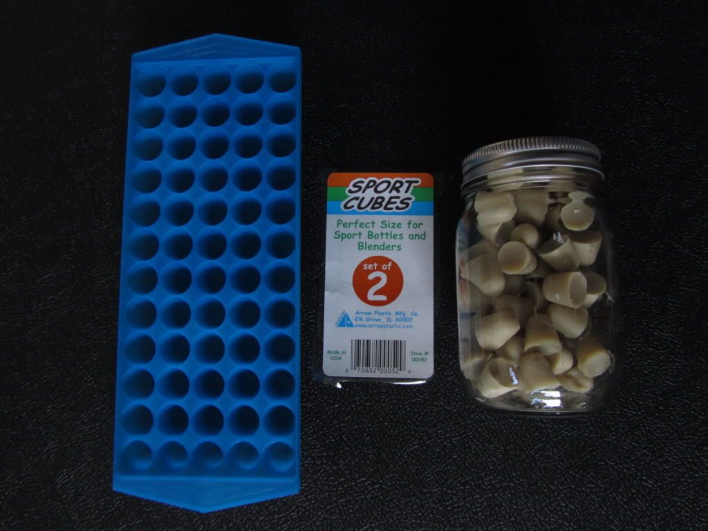 After a few tries with mixed results, I happened upon a style that works quite well: Sport Cubes, made by the Arrow Plastic, although I suspect any ice cube tray with similar characteristics would also work well. I happened to find mine at the local Fred Meyer store.